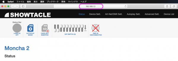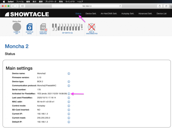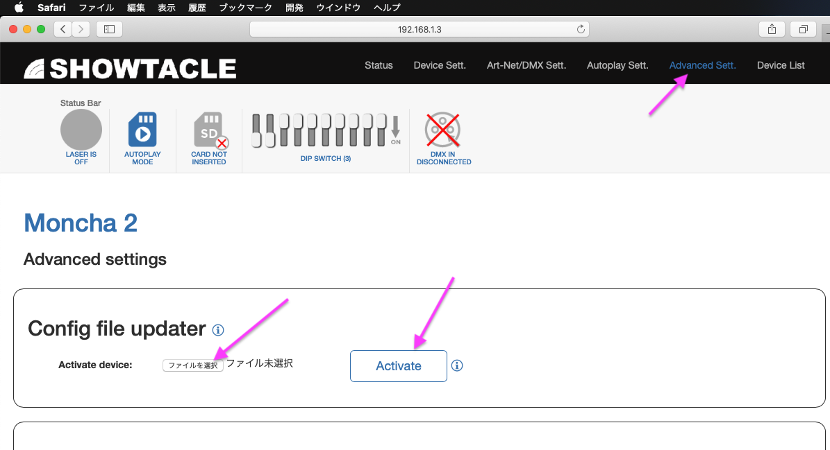 Moncha2関係をMacでも使える様にするには 1,Activation(ライセンス)キーを弊社より購入をします。 2,ブラウザーでMonca.box2(Moncha.go2)へアクセスをします。 MacとMonca.box2(Moncha.go2)をLANで接続 ブラウザーを起動してMonca.box2(Moncha.go2)のIPを入力し情報を見る 3,メニューのAdvanced sett.をクリック Config file updaterのActivate device:から購入したActivationキーを選択し、Activateをクリック 4,メニューのStatusをクリックしてMain settingsのActivated for FiestaMac: を確認する。有効期限が表示されます。