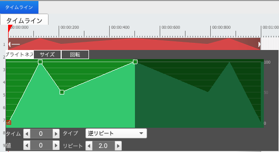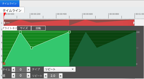 正確なキーフレームアニメーションを作成するためのタイムラインプロパティもあります。 タイムライン内の変化を左ダブルクリックして、これらのタイムラインプロパティを表示し、グラフのラインを変更する事も可能です。小さい四角の上で右クリックしカーブなど指定できます。