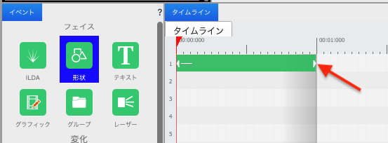 タイムラインに置かれた形状の時間(長さ)を小さな横向き三角形をマウスでつかみ調整することができます。