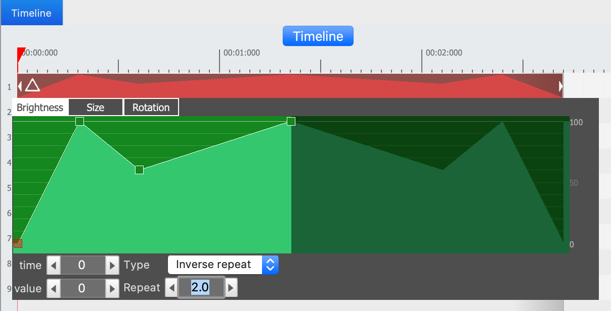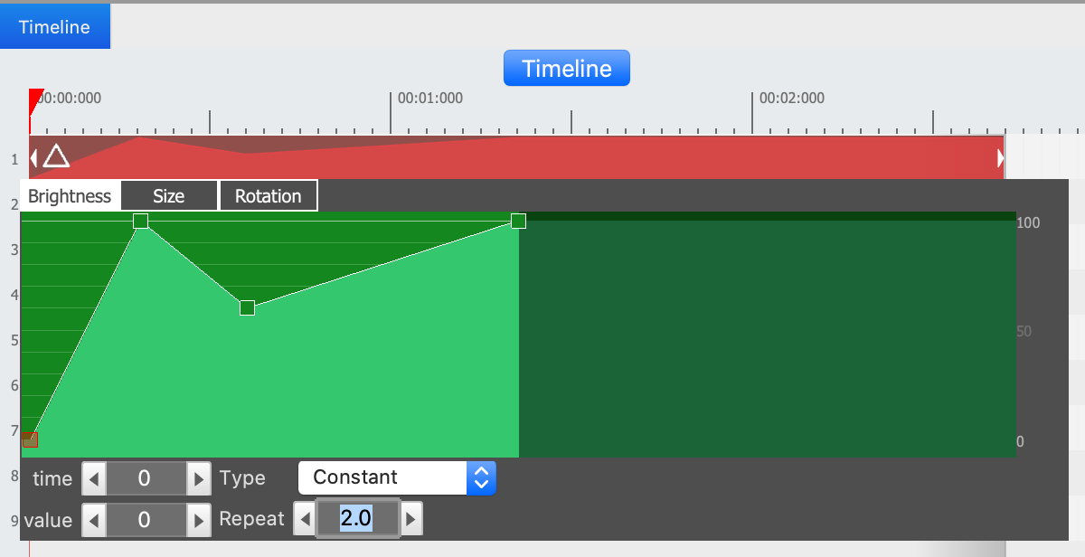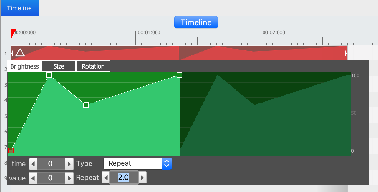お分かりのように、 ShapesではBrightness、 Size 、 Rotationを使うことができます。 マウスの左ボタンをダブルクリックして、プロパティグラフの1つに新しいキーフレームポイントを追加できます。 1つのプロパティにいくつでもキーフレームを含めることができます。